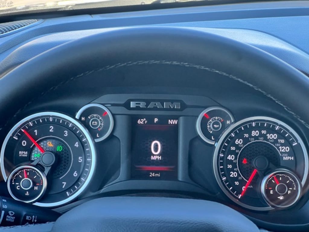 115V Auxiliary Power Outlet, 2nd Row In Floor Storage Bins, 3 Rear Seat Head Restraints, 33 Gallon Fuel Tank, 4 Way Front Headrests, 4-Wheel Disc Brakes, 400W Inverter, 48V Belt Starter Generator, 4G LTE Wi-Fi Hot Spot, 6 Speakers, ABS brakes, Accent Color Door Handles, Accent Color Premium Power Mirrors, Accent Color Tailgate Handle, Air Conditioning, Alloy wheels, AM/FM radio, Anti-Spin Differential Rear Axle, Apple CarPlay, Apple CarPlay/Android Auto, Auto High-beam Headlights, Auto Power-Folding Mirrors, Auto-Dimming Exterior Driver Mirror, Auto-Dimming Rear-View Mirror, Bed Utility Group, Big Horn Level 1 Equipment Group, Black Exterior Mirrors, Black Exterior Truck Badging, Black Headlamp Bezels, Black Interior Accents, Black Painted Exterior Mirrors Caps, Black Premium Power Mirrors, Black Tail Lamp Bezels, Body Color Fender Flares, Body Color Front Bumper, Body Color Rear Bumper w/Step Pads, Brake assist, Bucket Seats, Bumpers: chrome, Center Console Parts Module, Cloth Bucket Seats, Compass, Connectivity - US/Canada, Convex Wide-Angle Exterior Mirror Insert, Delay-off headlights, Deluxe Cloth Bucket Seats, Driver door bin, Dual Exhaust w/Black Tips, Dual front impact airbags, Dual front side impact airbags, Electronic Stability Control, Exterior 115V AC Outlet, Exterior Mirrors Courtesy Lamps, Exterior Mirrors w/Heating Element, Exterior Mirrors w/Supplemental Signals, Front anti-roll bar, Front Bucket Seats, Front Center Armrest w/Storage, Front fog lights, Front License Plate Bracket, Front reading lights, Front Seat Back Map Pockets, Front wheel independent suspension, Full Length Floor Console, Fully automatic headlights, Global Telematics Box Module (TBM), Glove Box Lamp, Google Android Auto, GPS Antenna Input, Grille Black Surround Black Mesh, Heated door mirrors, Heated Front Seats, Heated Steering Wheel, Illuminated entry, Integrated Center Stack Radio, Integrated Voice Command w/Bluetooth, Leather Wrapped Steering Wheel, Low tire pressure warning, Manual Adjust 4-Way Driver Seat, Manual Adjust 4-Way Front Passenger Seat, Manual Folding Exterior Mirrors, Manufacturer's Statement of Origin, MOPAR 4 Adjustable Cargo Tie-Down Hooks, MOPAR Spray In Bedliner, Night Edition, Occupant sensing airbag, Outside temperature display, Overhead airbag, Overhead console, Panic alarm, ParkView Rear Back-Up Camera, Passenger door bin, Passenger vanity mirror, Pick-Up Box Lighting, Power 2-Way Driver Lumbar Adjust, Power Adjust 8-Way Driver Seat, Power Adjustable Pedals, Power door mirrors, Power steering, Power windows, Protection Group, Quick Order Package 27Z Big Horn, Radio data system, Radio: Uconnect 5 W w/8.4" Display, RAM Grille Badge - Black, RAM Grille Badge - Chrome, Rear 60/40 Folding Seat, Rear anti-roll bar, Rear Center Armrest, Rear Dome w/On/Off Switch Lamp, Rear Power Sliding Window, Rear step bumper, Rear Wheelhouse Liners, Rear Window Defroster, Remote keyless entry, SiriusXM Radio Service, SiriusXM Satellite Radio, Speed control, Steering Wheel Mounted Audio Controls, Sun Visors w/Illuminated Vanity Mirrors, Supplier Part Tracking (J-1), Tachometer, Telescoping steering wheel, Tilt steering wheel, Tow Hooks, Traction control, Trailer Brake Control, Trip computer, Universal Garage Door Opener, USB Host Flip, Variably intermittent wipers, Voltmeter, Wheels: 18" x 8" Cast-Aluminum Painted, Wheels: 20" x 9.0" Aluminum Painted Clad.