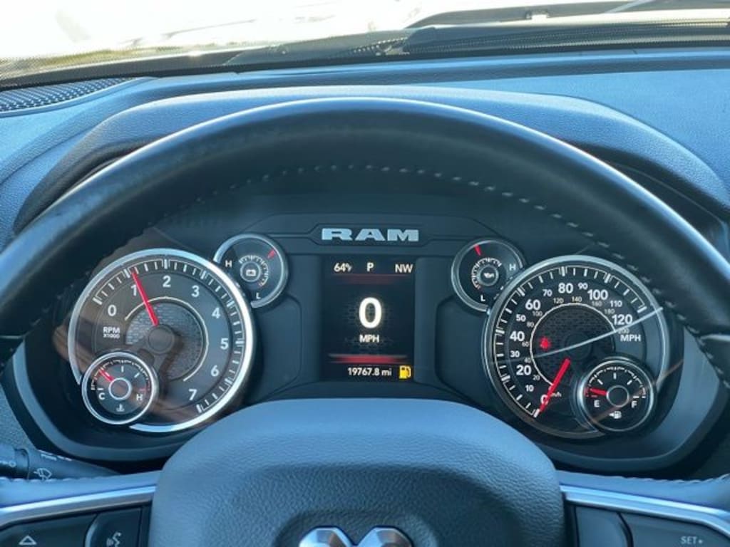 Value Pricing. Odometer is 8135 miles below market average! 2 Way Rear Headrest Seat, 2nd Row In Floor Storage Bins, 3.73 Axle Ratio, 4 Way Front Headrests, 4-Wheel Disc Brakes, 40/20/40 Split Bench Seat, 4G LTE Wi-Fi Hot Spot, 6 Speakers, 8.4" Touchscreen Display, 9 Alpine Speakers w/Subwoofer, ABS brakes, Active Noise Control System, Air Conditioning, Anti-Spin Differential Rear Axle, Apple CarPlay, Auto Power-Folding Mirrors, Bed Utility Group, Big Horn IP Badge, Black Exterior Mirrors, Bluetooth Handsfree Phone & Audio, Brake assist, Bumpers: chrome, Center Hub, Center Stack Storage Drawer, Chrome Flat Cab-Length Side Steps, Cloth 40/20/40 Bench Seat, Compass, Connectivity - US/Canada, Delay-off headlights, Driver door bin, Dual front impact airbags, Dual front side impact airbags, Dual Glove Boxes, Electronic Stability Control, Electronically Controlled Throttle, Emergency communication system: SiriusXM Guardian, Exterior Mirrors Courtesy Lamps, Exterior Mirrors w/Heating Element, Exterior Mirrors w/Supplemental Signals, Foam Bottle Insert (Door Trim Panel), Footwell Courtesy Lamp, For Details, Visit DriveUconnect.com, For More Info, Call 800-643-2112, Forward & Reverse Utility Lights, Front anti-roll bar, Front Armrest w/Cupholders, Front Center Armrest w/Storage, Front Center Seat Cushion Storage, Front Fog Lamps, Front License Plate Bracket, Front reading lights, Front Seat Back Map Pockets, Fully automatic headlights, Global Telematics Box Module (TBM), Glove Box Lamp, Google Android Auto, GPS Antenna Input, Heated door mirrors, Illuminated entry, Integrated Center Stack Radio, Integrated Voice Command w/Bluetooth, Leather Wrapped Steering Wheel, LED Bed Lighting, Level 1 Equipment Group, Locking Lower Glove Box, Low tire pressure warning, Manual Adjust 4-Way Driver Seat, Manual Adjust 4-Way Front Passenger Seat, Manufacturer's Statement of Origin, Mirror Running Lights, MOPAR Deployable Bed Step, MOPAR Spray In Bedliner, Occupant sensing airbag, Outside temperature display, Overhead airbag, Overhead console, Panic alarm, ParkView Rear Back-Up Camera, Passenger door bin, Passenger vanity mirror, Power 2-Way Driver Lumbar Adjust, Power Adjust 8-Way Driver Seat, Power Adjust Mirrors, Power Adjustable Convex Aux Mirrors, Power door mirrors, Power Heated Fold Telescope Mirrors, Power steering, Power Telescoping Mirrors, Power windows, Premium Cloth 40/20/40 Bench Seat (DISC), Protection Group, Quick Order Package 2GZ Big Horn, Radio data system, Radio: Uconnect 3 w/5" Display, Radio: Uconnect 5 W w/8.4" Display, Rear 60/40 Folding Seat, Rear anti-roll bar, Rear Dome w/On/Off Switch Lamp, Rear Folding Seat, Rear seat center armrest, Rear step bumper, Remote keyless entry, Remote USB Port - Charge Only, Selectable Tire Fill Alert, SiriusXM Radio Service, SiriusXM Satellite Radio, Speed control, Steering Wheel Mounted Audio Controls, Storage Tray, Tachometer, Tilt steering wheel, Tip Start, Tow Hooks, Traction control, Trip computer, Turn signal indicator mirrors, Variably intermittent wipers, Voltmeter, Wheels: 18" x 8.0" Polished Aluminum, Wheels: 18" x 8.0" Steel Chrome Clad. Clean CARFAX. CARFAX One-Owner. 4WD